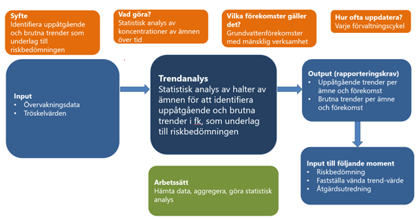 Trender och eventuella trendbrott ska beräknas för alla förorenande ämnen, både för enskilda stationer och aggregerat för hela grundvattenförekomsten. Det är också möjligt att utföra trendanalyser på grupper av förekomster. Det kan förekomma stora variationer i föroreningsgrad och trender inom en och samma grundvattenförekomst. För att planera in åtgärder på rätt plats är det viktigt att veta var i grundvattenförekomsten en uppåtgående trend identifierats.