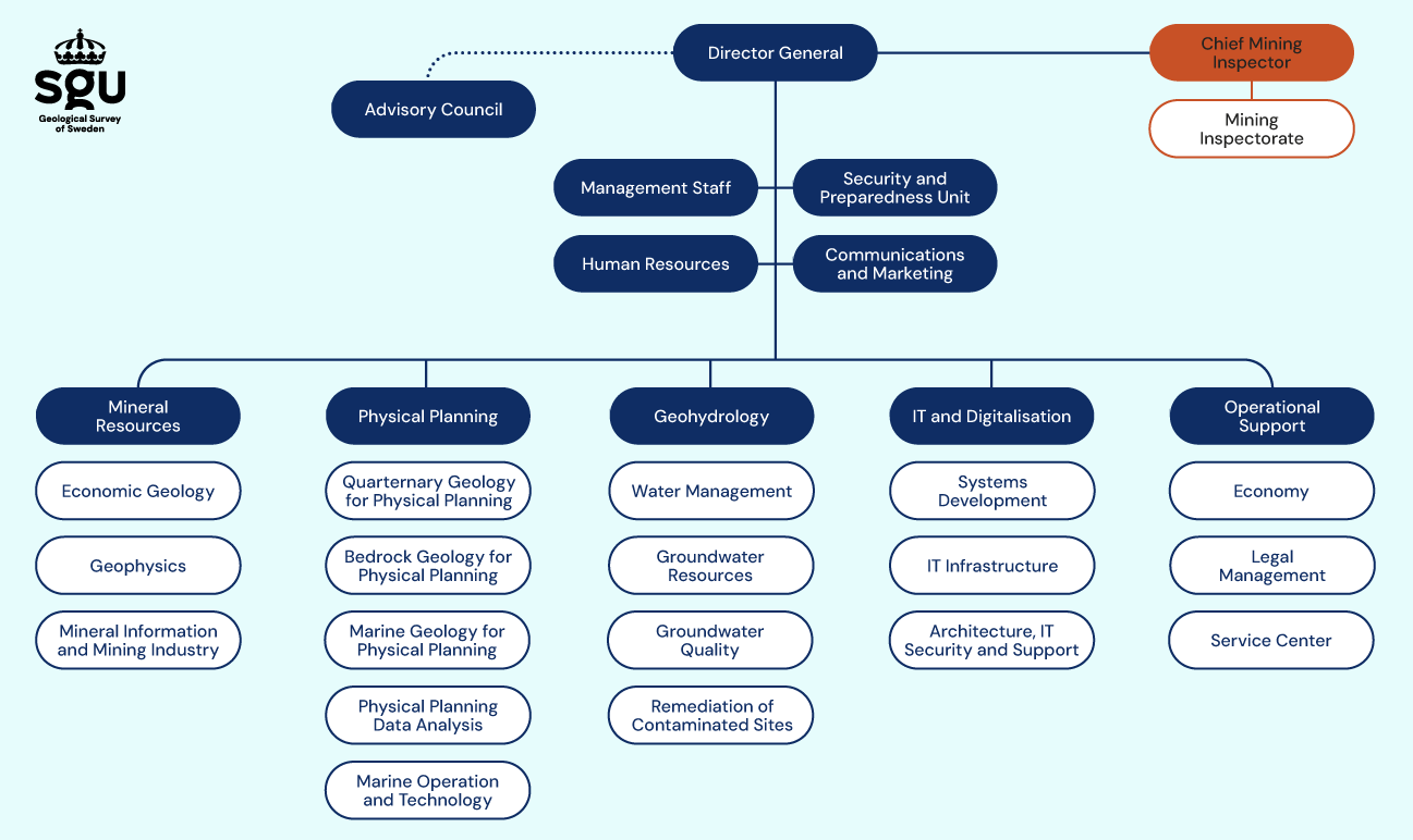 One of the departments is the Mining Inspectorate. This is the official body in Sweden responsible for issuing permits for exploration and mining. The Mining Inspectorate is headed by the Chief Mining Inspector.