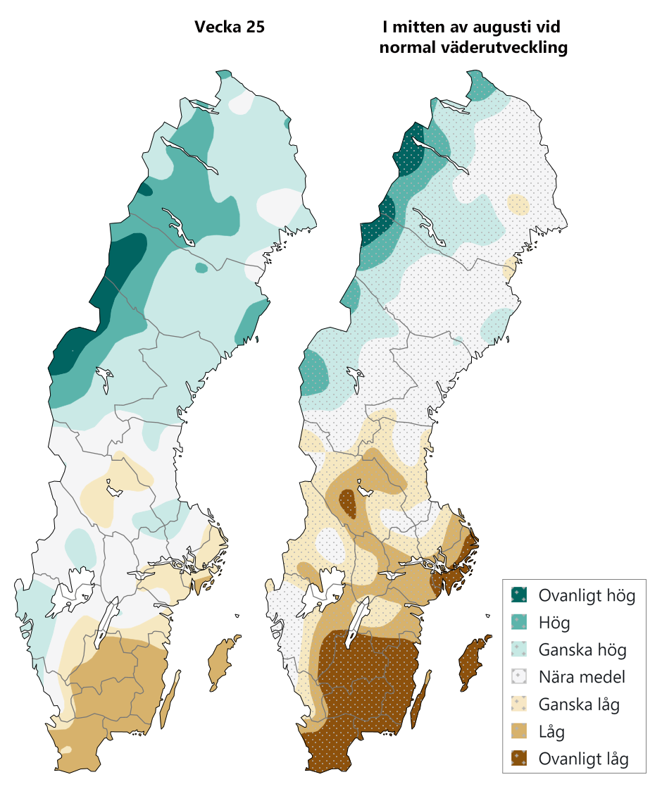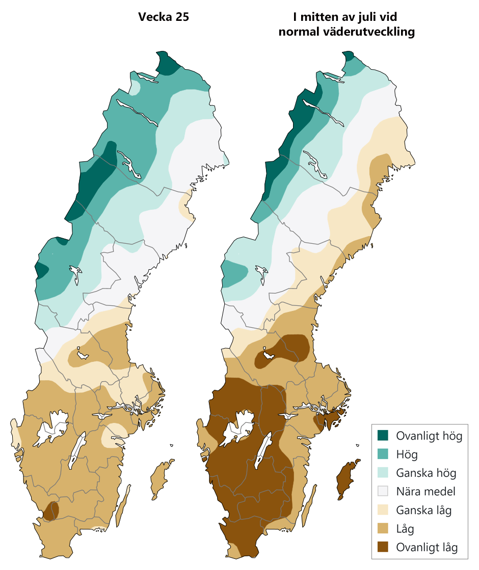 SGU:s beräkningar för utvecklingen i små magasin den närmaste tiden indikerar att, vid ett normalt sommarväder, kommer sannolikt större delen av Götaland och Svealand att ha låga eller ovanligt låga nivåer i mitten av juli. Detta beror på att det mesta av regnet som faller under sommarmånaderna tas upp av växter eller avdunstar, vilket gör att det inte sker någon påfyllning av grundvatten. Med anledning av grundvattensituationen i nuläget sammanvägt med prognoser baserat på tidigare års väder utfärdar SGU idag meddelande om risk för vattenbrist på grund av låga grundvattennivåer i Stockholms, Södermanlands och Örebro län. Sedan tidigare finns meddelanden utfärdat för små magasin i Gotlands, Kalmar, Skåne, Blekinge, Kronobergs, Jönköpings, Hallands och Västra Götalands län.